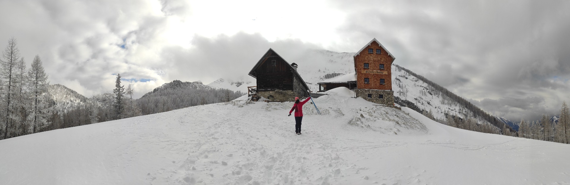 Poměrně rychle se zledovatělá cesta mění v úzkou cestičku vyšlapanou hlubokým sněhem uprostřed průsmyku stoupajícího strmě vzhůru. Na to, že je okolo nás přes dva metry sněhu se nám jde dobře - je to sice fuška, ale cesta krásně ubíhá a proto relativně rychle přicházíme po 1,8 kilometrech a asi polovině výškových metrů na rozcestí kde se odpojujeme z cesty Seespitz a držíme se vpravo po cestě Wanderweg 299. Protože máme krásný čas trochu zvolňujeme tempo chůze a užíváme si hlubokého sněhu, zkoušíme kolik metrů ho je pod námi a Adam skáče salta do měkké peřinky. Ve výšce 1370 m.n. m. uprostřed ničeho se před námi zjevují zasněžené střechy třech stavení, o kterých jsme předem neměli ani tušení. Dveře jsou hluboko pod sněhem, okna sotva vykukují. Koukám do mapy a Adam se brodí dvoumetrovými závějemi prozkoumat místo s názvem Zickalm blíž. Na první pohled to vypadalo, že se jedná o nějaká zapomenutá stavení, ale opak byl pravdou. Cesta ke dveřím byla odházená a rozhodně tu už tuhle zimu někdo byl. Zkrátka místo jako z pohádky. Mezitím co Adam prozkoumával okolí chaloupky, já jsem se vydala dál, abych aspoň jednou měla taky náskok. Většinou, teda spíš vždycky, se ploužím někde vzadu a Adam na mě pořád čeká. Po dalším asi půl kilometru se dostáváme ze sotva vyšlapané cestičky na hezčí cestu, končí před námi les a začíná se objevovat střecha Dümlerhütte - krásná alpenvereinová třípatrová chata.